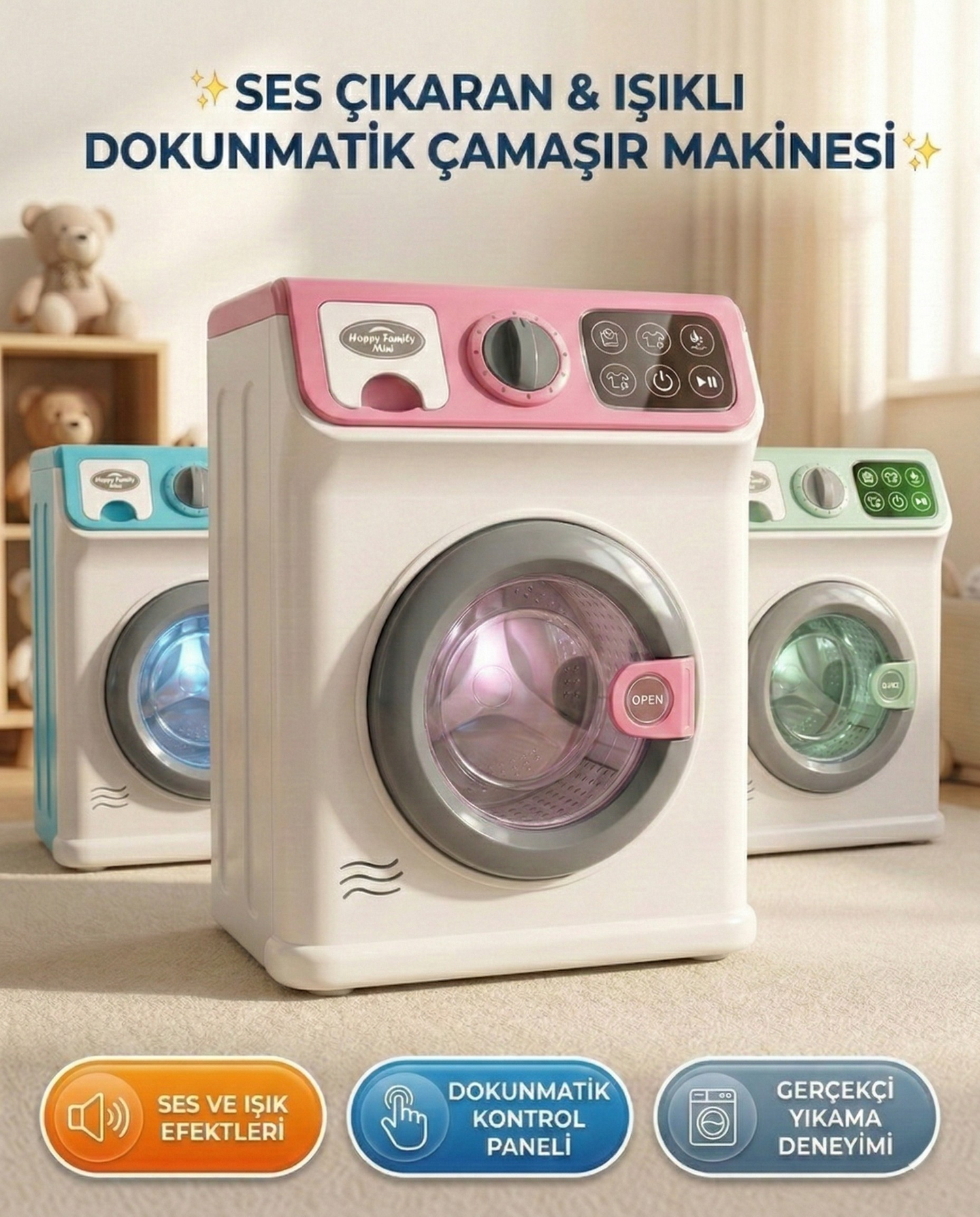 Sesli ve ışıklı dokunmatik çamaşır makinesi, miniklere yalnızca oyun değil, gerçek hayattan bir deneyim sunar.